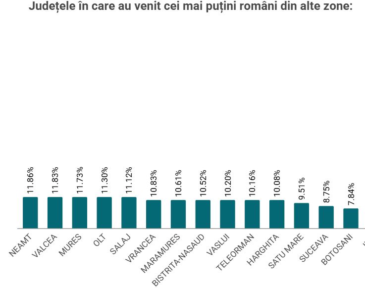 La polul opus, județele din nord-estul țării, precum Botoșani (7,8%) și Suceava (8,7%), rămân zone cu o populație preponderent autohtonă, nereușind să atragă fluxuri semnificative de migranți interni, ci funcționând mai degrabă ca bazine de emigrare.
