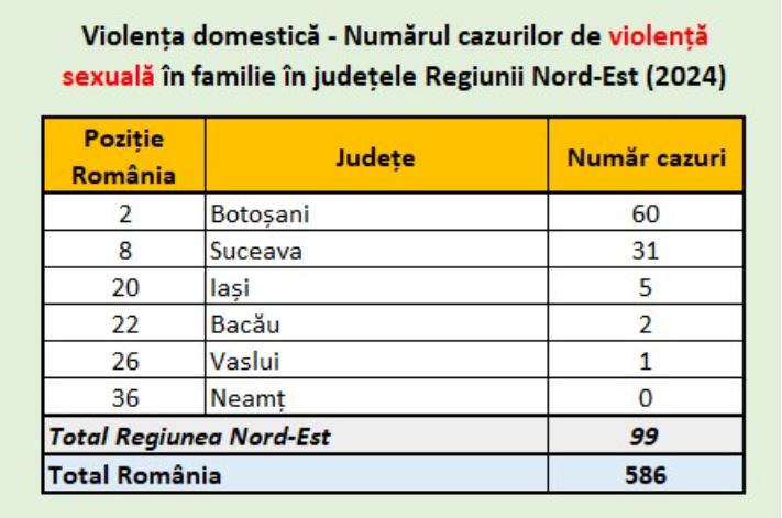 Botoșani, cu 440 de cazuri, se remarcă printr-un număr foarte mare de violență psihologică (134 de cazuri) și de violență sexuală (60 de situații raportate), ceea ce îl plasează în fruntea regiunii la acest capitol. De asemenea, este singurul județ care a înregistrat toate cele nouă tipuri de violență, inclusiv două cazuri încadrate la „alte forme”, ceea ce arată o diversitate a abuzurilor și, poate, o mai bună capacitate de identificare și raportare.