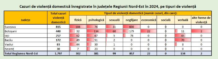 Cea mai răspândită formă de violență din România a fost neglijarea, o formă de abuz mai puțin vizibilă, dar cu efecte profunde asupra sănătății emoționale și fizice a victimelor. Cu peste 6.200 de cazuri raportate, acest tip de violență domestică domină statisticile, urmată de violența fizică, care a afectat peste 2.700 de persoane. Violența psihologică se menține la un nivel îngrijorător, cu peste 2.000 de cazuri, în timp ce violența sexuală, deși mai puțin frecventă în raportările oficiale, a fost prezentă în aproape 600 de situații, scrie Ziarul de Iași.