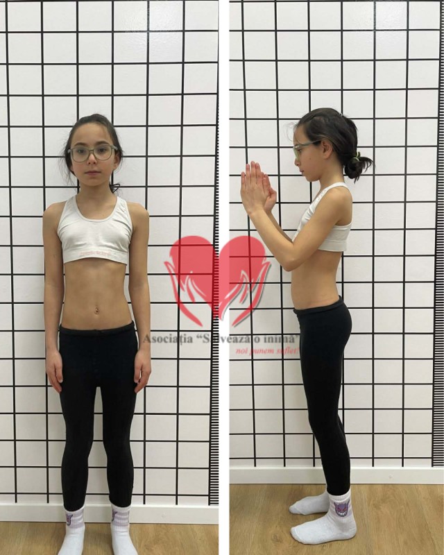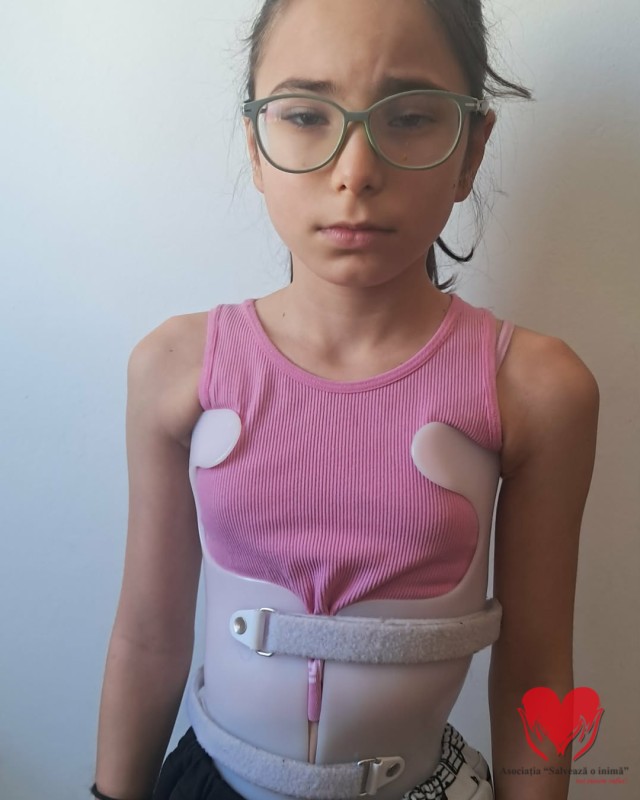 Eva poartă corset Cheneau. Face terapie Schroth. Merge la școală. Zâmbește. Își face temele. La exterior, pare un copil obișnuit.