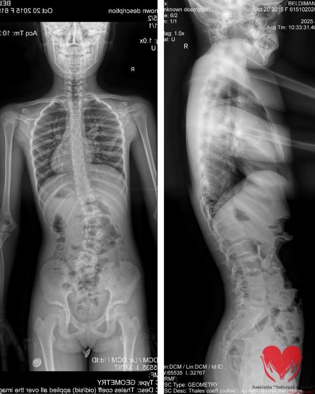 Totul a fost descoperit întâmplător, la 5 ani, în urma unei radiografii. Medicii căutau un bănuț înghițit accidental. Au găsit însă altceva: o coloană care nu creștea drept. În timp, investigațiile au confirmat scolioza toraco-lombară, iar cauza a devenit clară – o vertebră formată incomplet, care împinge coloana să se deformeze progresiv.