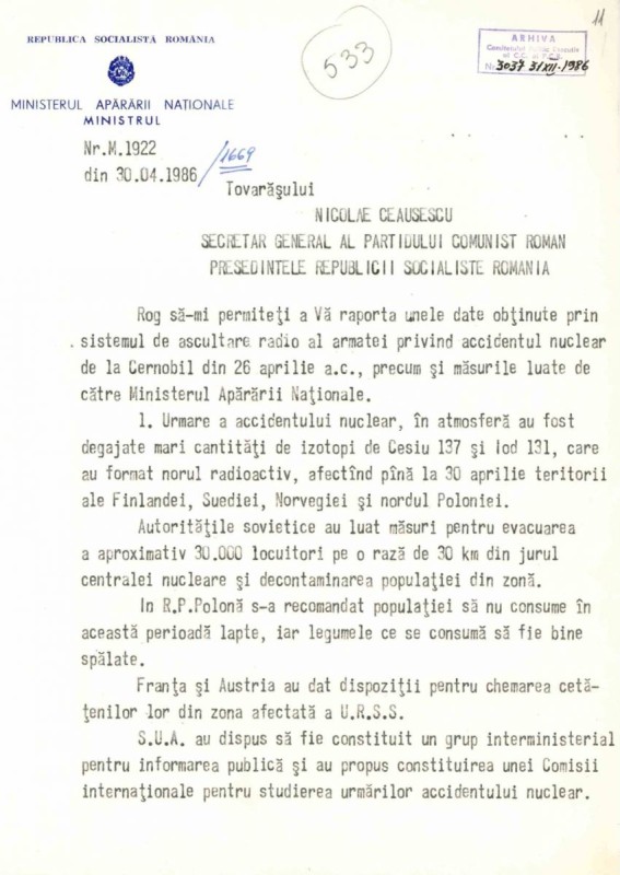 Nicolae Ceaușescu dă indicații ferme: ”Cred că trebuie să facem imediat o informare pentru opinia publică. Sigur, fără să dăm date, dar ceva mai larg decât am dat. Să spunem: având în vedere situația creată de accidentul produs, au apărut unele creșteri ale radioactivității în diferite zone ale țării noastre, îndeosebi în nord-est; având în vedere direcția vântului au fost stabilite măsurile necesare și vor fi informați asupra măsurilor. Și că, de asemenea, s-a creat un comandament permanent, având în vedere situația aceasta specială, una grup, format din tovarăși din conducerea partidului, care urmărește toate aceste probleme. Și să spunem așa: la Comitetul Central s-au analizat aceste problem, s-a informat și s-au stabilit aceste măsuri”.