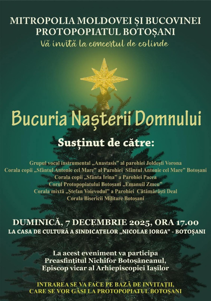 Duminică, 7 decembrie, va avea loc un concert de colinde organizat de Mitropolia Moldovei și Bucovinei – Protopopiatul Botoșani. Acesta se intitulează „Bucuria Nașterii Domnului”.