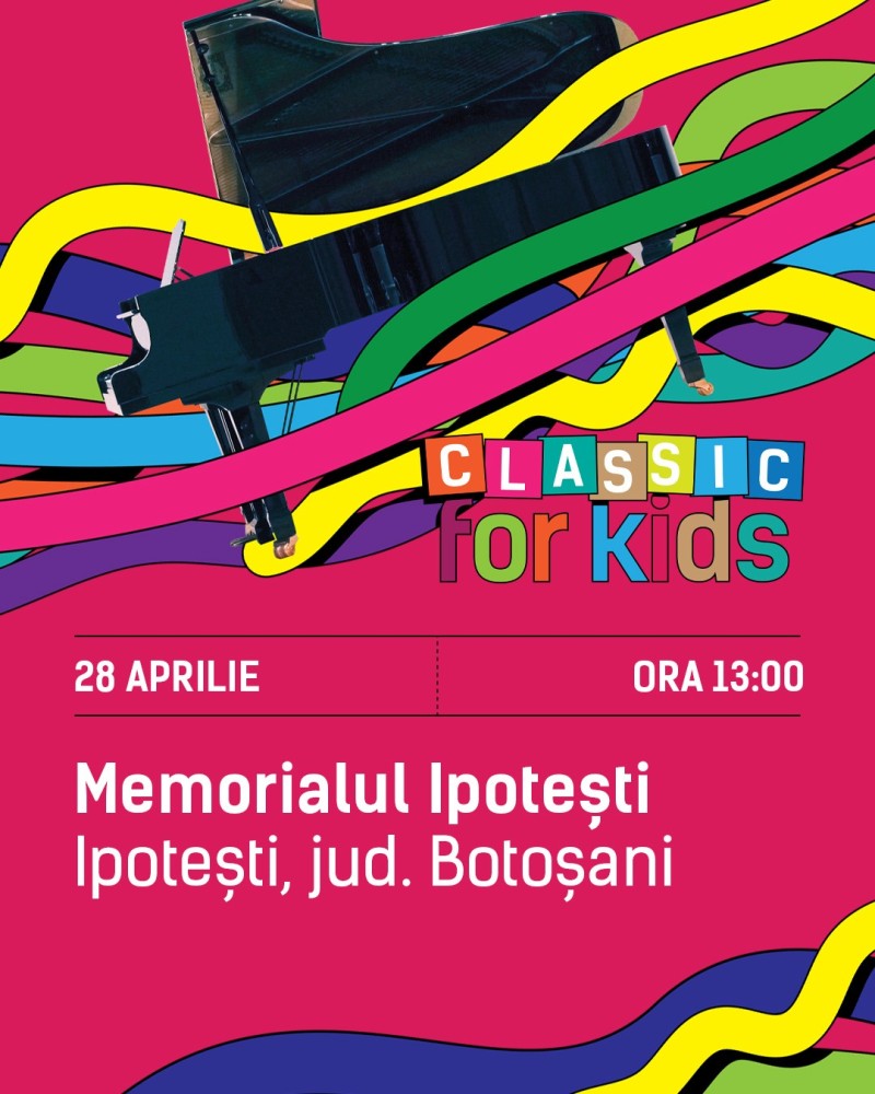 Classic for Kids revine cu 22 de concerte și ateliere muzicale adaptate copiilor, în 7 județe din România. Unul dintre ateliere va avea loc la Ipotești pe data de 28 aprilie, începând cu ora 13:00. Înscrierile se pot face trimițând un mesaj cu tema „Classic for Kids” pe adresa Memorialului Ipotești: m.ipotesti@gmail.com până pe data de 26 aprilie.