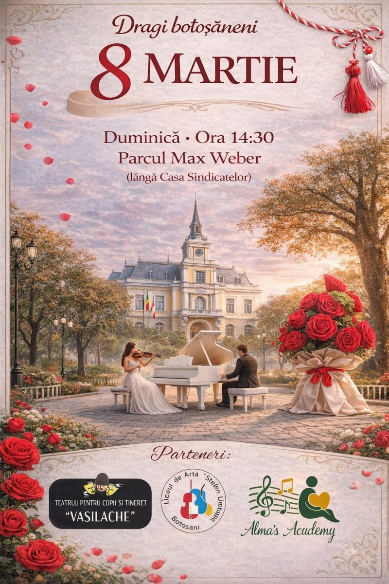 Duminică, de la ora 14:30, în Parcul „Max Weber”, lângă Casa Sindicatelor, va avea loc un moment artistic deosebit: un dialog muzical între pian și vioară, un schimb de armonii și emoții dedicat femeilor din viața noastră. Evenimentul este organizat în parteneriat cu Teatrul pentru Copii și Tineret „Vasilache”.