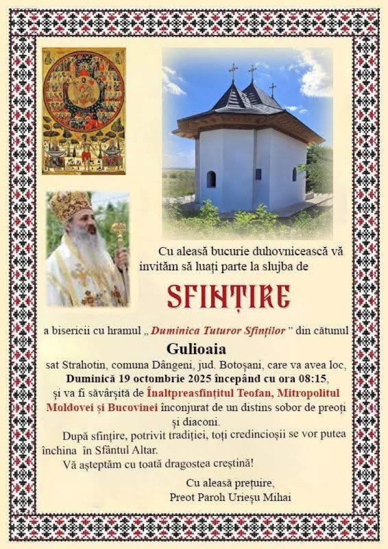 Biserica „Duminica Tuturor Sfinților” din cătunul Gulioaia, satul Strahotin, comuna Dângeni, va fi sfințită pe 19 octombrie.