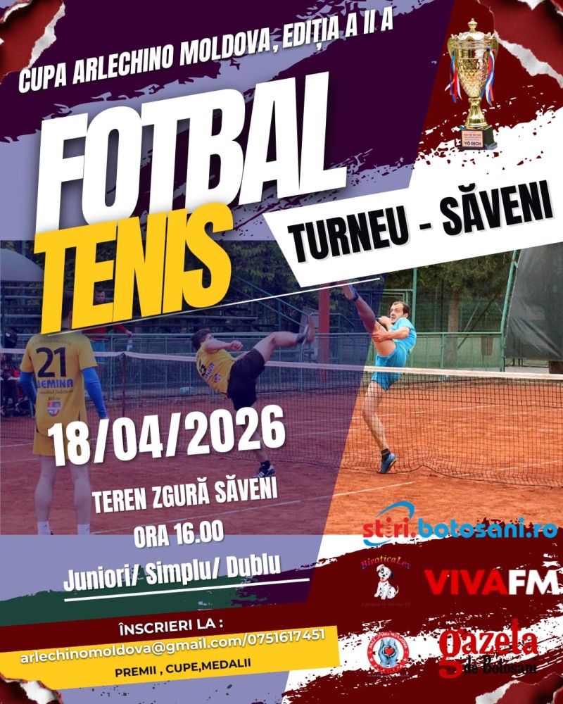 Asociația Arlechino Moldova organizează a doua ediție a Turneului de fotbal și tenis de la Săveni. Evenimentul sportiv va avea loc pe data de 18 aprilie 2026, de la ora 16:00, pe terenul de zgură din orașul amintit anterior.